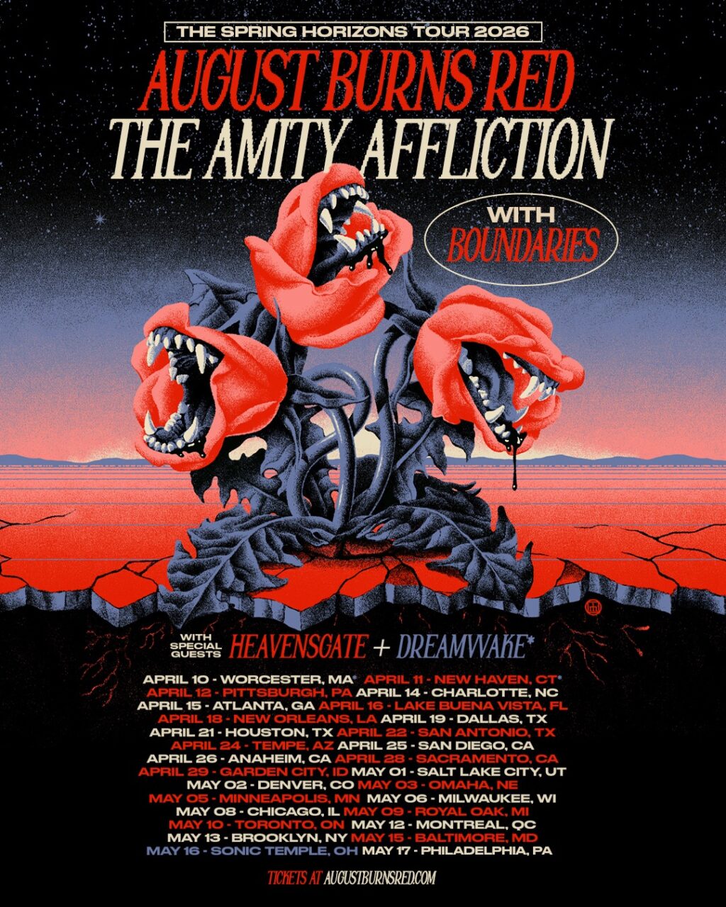 “We’re pumped to be joining forces with The Amity Affliction for what’s sure to be the can’t miss metal tour of the spring,” says August Burns Red. “ABR will be debuting a few brand new songs and bringing the shred alongside Boundaries, Heavensgate, and Dreamwake. We’ll see you all this April and May for the Spring Horizons Tour!”