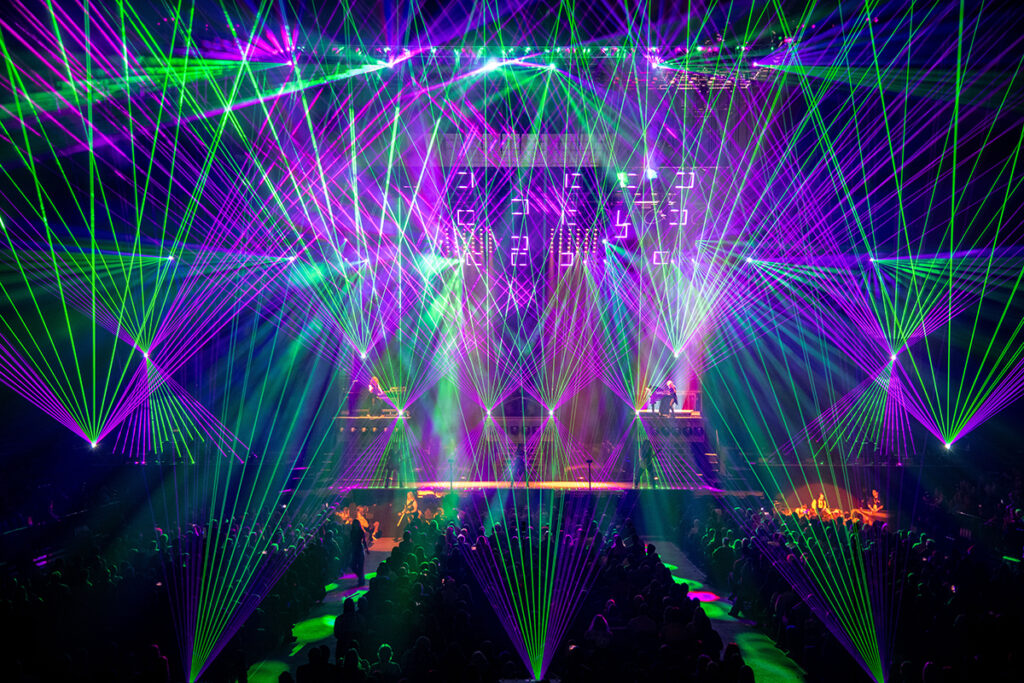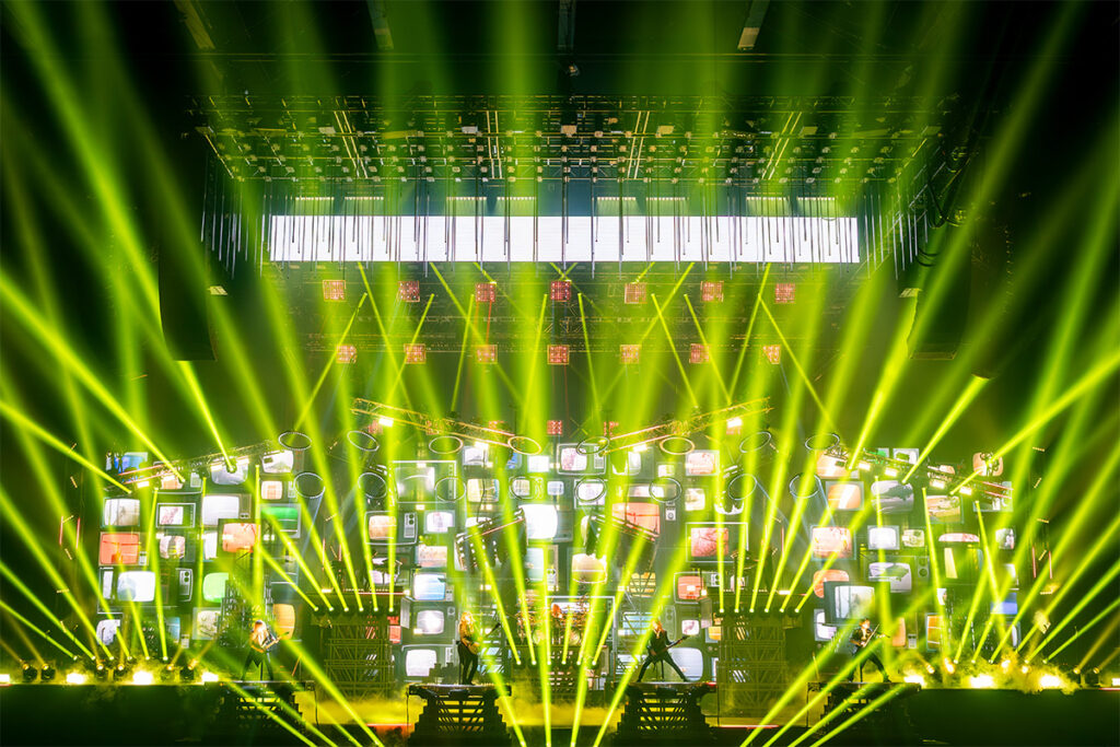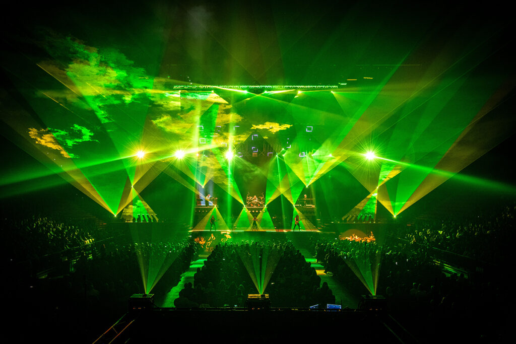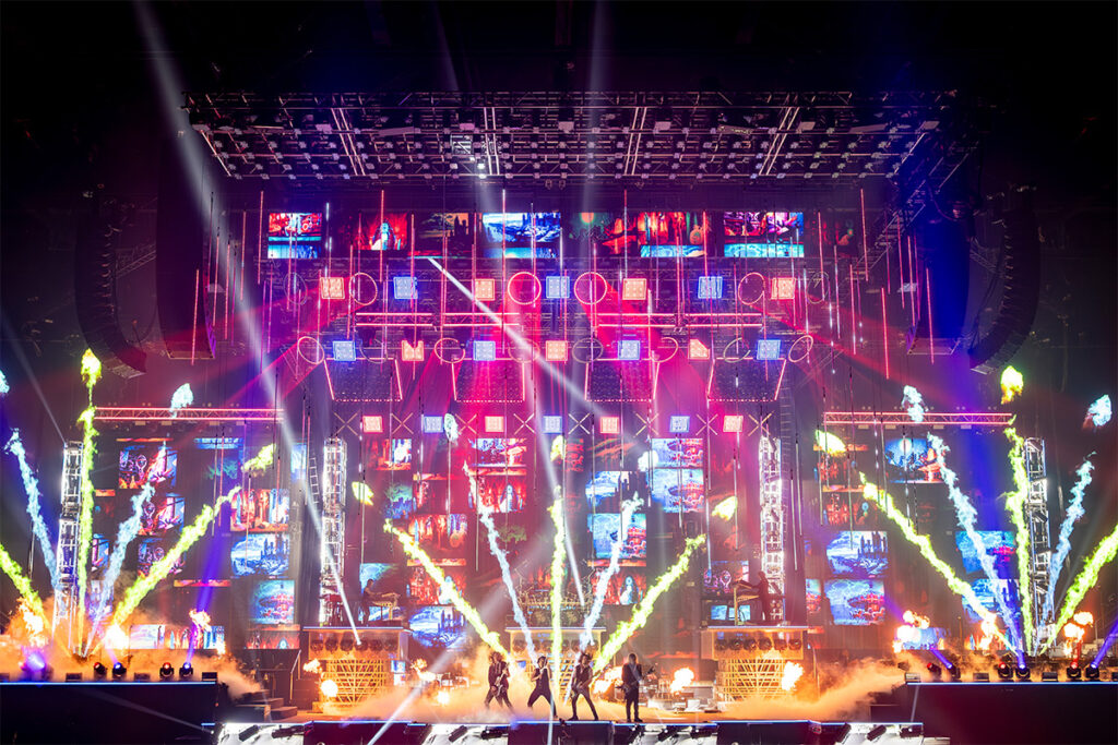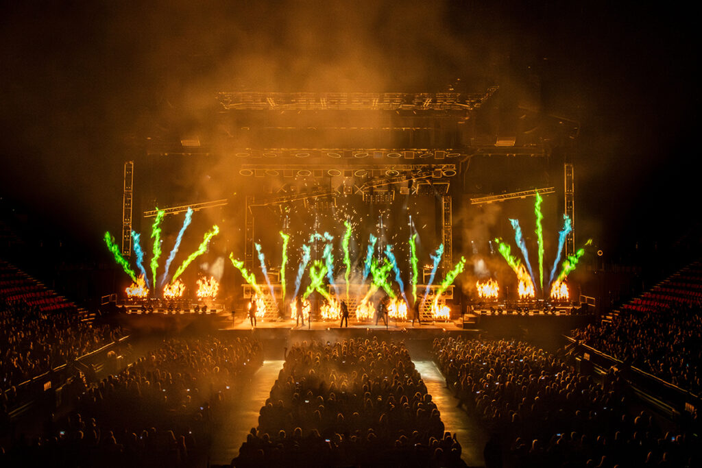 We see hundreds of kilowatts of laser lights that danced around the arena and sliced distorted through climbing clouds of stage fog, flames of fire stretching thirty or more feet into the air, artificial snow, dazzling AI video images, and hydraulic risers that bring performers high up into the arena. It’s always breathtaking to behold such sights, and it’s glorious to hear it in the heavy metal language of riffs, time changes, solos, walls of vocals, and pure long-held notes of every kind.